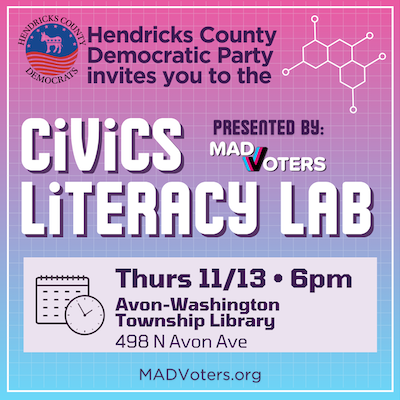 The HCDP will be hosting a Civics Literacy Lab on Nov 13, 2025 (6:00 pm EST) at the Avon-Washington Township Public Library presented by MADVoters Indiana. The presentation is an interactive workshop that covers topics such as voter registration and eligibility, understanding the role of government officials and the legislative process, and much more, including how you can get involved in the democratic process with a level of commitment that suits your lifestyle and the needs of your community.